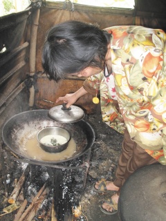 簡陋破落帳篷搭在香蕉園里,卓姓夫妻與兒子擠在不到兩坪的空間里;室內堆放著臟亂衣物等用品,睡覺的地方用木板稍隔開,陳設比起工寮還要簡陋。緊鄰廚房僅有一只燒柴鍋子,卓家女主人鍋子正在蒸蛋,蒸蛋的水暗沉,她說:“這是早餐!