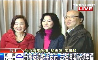 中新網(wǎng)1月29日電 據(jù)臺(tái)灣TVBS報(bào)道,帽子天后鳳飛飛為了明天演唱會(huì),29日下午提前到臺(tái)中和市長胡志強(qiáng)、市長夫人邵曉鈴進(jìn)行一場敘舊茶會(huì)。