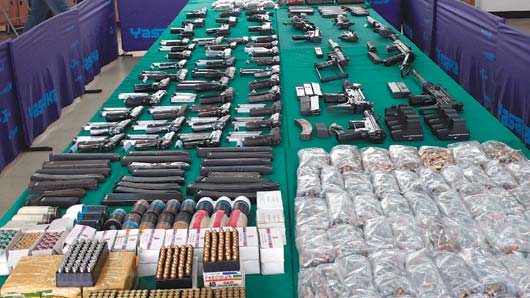 警方說(shuō),共起出39支手槍、15支沖鋒槍、一支散彈槍、兩組槍榴彈發(fā)射器、卡賓槍一支及子彈18340發(fā)。