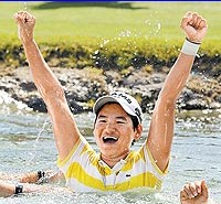 中新網(wǎng)4月6日電 據(jù)臺(tái)灣媒體報(bào)道,臺(tái)灣高球天后曾雅妮5日在LPGA(Ladies Professional Golf Association,女子職業(yè)高爾夫巡回賽)四大賽之一、納比斯科錦標(biāo)賽中擊敗世界前10名高手,奪下后冠,獲得30萬美元獎(jiǎng)金,也是賽史上第1位摘冠的華人球員。曾雅妮奪冠后激動(dòng)得舉起雙手,興高采烈地依照傳統(tǒng)躍進(jìn)水池中慶祝。