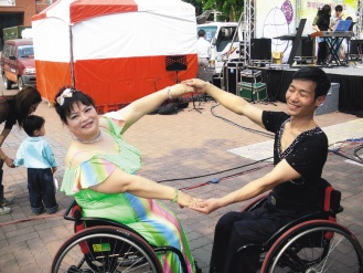 3年前梁春錦罹患乳癌,手術(shù)后以運(yùn)動(dòng)抗癌,她游泳、跳輪椅國標(biāo)舞及練瑜珈。蘇俊源為陪伴妻子,也一起練習(xí),兩人成為舞伴,也加入志工,經(jīng)常參加活動(dòng),夫妻倆坐著輪椅跳國標(biāo)舞,鼓勵(lì)了許多殘障者。