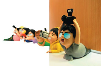 她設(shè)計(jì)6種不同的狗仔隊(duì)造型,包括攝影記者高舉雙手拿著相機(jī)、女記者拿著麥克風(fēng)往前擠、攝影記者扛著攝影機(jī)側(cè)身拍照等。陳郁青表示,通常門(mén)縫都有一點(diǎn)小空隙,加上狗仔隊(duì)門(mén)擋后,好像狗仔隊(duì)從門(mén)縫中爬出,她自己也覺(jué)得很有趣。