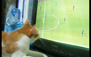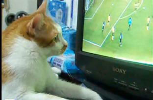中新網(wǎng)6月22日電 據(jù)臺(tái)灣“今日新聞”報(bào)道,2010世界杯足球賽不僅是全球人們關(guān)注的焦點(diǎn),連貓咪也喜歡,據(jù)了解,臺(tái)灣一只名叫加菲(GARFIELD)的貓咪,竟然緊貼在電視機(jī)前,無比專注地盯著轉(zhuǎn)播,還會(huì)激動(dòng)地伸出貓爪,對(duì)著熒幕又拍又打。
