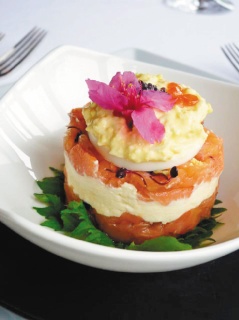 春秋烏來(lái)渡假酒店也在櫻花季節(jié)推出櫻花季套餐,用櫻花入菜,像櫻花煙熏鮭魚塔,以煙熏鮭魚加入洋蔥碎、酸豆及日本四季紅,中間夾入酸奶與奶油起司泥,酸甜可口,新推櫻花甜點(diǎn)也很有特色。