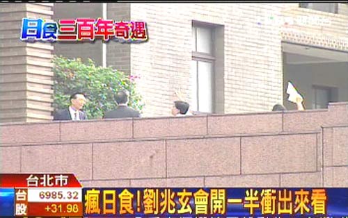 中新網(wǎng)7月22日電 據(jù)臺灣媒體報道,盡管臺灣只能看到日偏食,但民眾“追日”熱情高漲,政治人物也不例外。臺當(dāng)局“行政院長”劉兆玄與副手邱正雄等人今天上午在辦公室開會,剛到一半就沖到二樓陽臺看熱鬧。