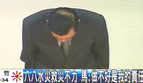 馬英九今日下午率領包括蕭萬長、“行政院副院長”邱正雄等人,向媒體強調(diào)救災決心,馬英九也率領全體與會官員向民眾180度鞠躬致歉,長達十秒鐘之久。
