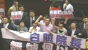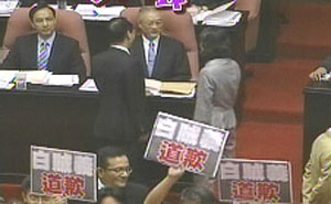 據(jù)臺灣TVBS報道,吳敦義還沒上臺,事前保密到家的民進黨“立委”們,突然拿著白布條、標語霸占主席臺,大喊“白賊義,道歉”,稱吳敦義香港行的說法一變再變,有誠信問題。吳敦義則留在原位,國民黨人上前安撫,也做護駕動作,避免與民進黨“立委”發(fā)生肢體沖突。