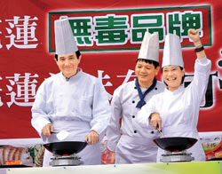 國民黨主席馬英九(左)與花蓮縣長候選人杜麗華(右),一同裝扮成廚師炒菜,為光豐農(nóng)會無毒農(nóng)業(yè)代言。圖片來源:臺灣《中國時(shí)報(bào)》
