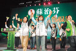蘇治芬萬人造勢會,主席蔡英文(左)聯(lián)手為該黨“三合一”候選人輔選。圖片來源:臺灣《中國時(shí)報(bào)》