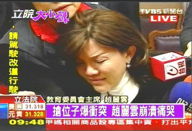 而上個星期才因為沖突昏倒送醫(yī)的“主席”趙麗云,26日再度看到這樣混亂場面,一度痛哭。“教育委員會主席”趙麗云:“我們要開會,我們要按規(guī)則開會,請所有的不管那個黨派的,要對得起人民,我們是拿薪水來開會,不是來打架的!