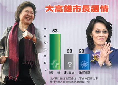 報道說,調(diào)查發(fā)現(xiàn),陳菊親民形象較黃昭順略勝一籌。55%選民對于陳菊有好印象,19%不喜歡她;相對來說,喜歡和不喜歡黃昭順的選民各占32%與19%,48%沒有深刻印象。從現(xiàn)階段支持率來看,陳菊目前獲得53%選民支持,黃昭順支持率23%,僅23%未決定。進(jìn)一步分析顯示,陳菊不僅在泛綠及中立選民獲得壓倒性支持,即便是泛藍(lán)支持者,也有25%屬意陳菊擔(dān)任大高雄市長。
