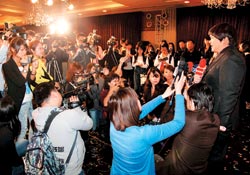 記者會上,SONY播小胖的歷程VCR,他也高唱成名曲〈I Will Always Love You〉,看到臺下成群結(jié)隊的粉絲,拿著“小胖”、“加油”的牌子,他突然哽咽:“謝謝你們,我一定會加油,不辜負(fù)大家的期望!彪S即拿起手帕拭淚,笑稱:“我鼻酸,感覺很激動,淚水混著汗水掉下來了!贝箨慡ONY歌手李易峰和蘇醒,分別吆喝自己粉絲,到場替師弟小胖加油打氣。