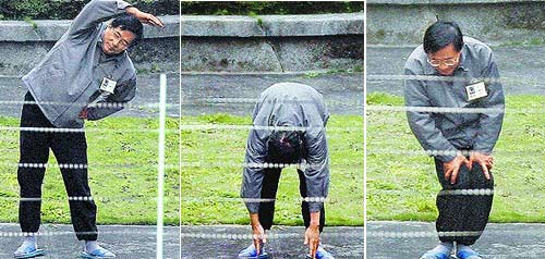 接著扁開始抬腿、散步暖身,還向記者打招呼,然后扁開始抬膝蓋、雙手上下左右伸展;扁雙手向上舉時(shí)一度停了一分半鐘,還臉帶笑意朝記者望去,似乎故意要擺給記者看。