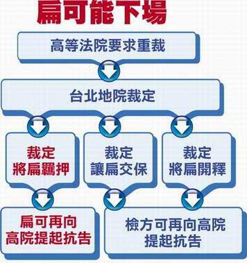 陳水扁去年底被起訴、無保釋放后,立即提起抗告,臺灣高等法院于十二月十七日認(rèn)為,扁可能在審判中影響證人造成案件審理困難,駁回抗告;十二月二十八日,法院認(rèn)定扁的犯罪嫌疑重大,且扁家在海外有十幾億元資產(chǎn),隨扈又無法確實(shí)監(jiān)管其行蹤,有逃亡、勾串、滅證等羈押理由;今年一月七日時,仍認(rèn)同檢方意見,同意押扁。
