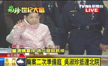 吳淑珍素顏穿著一身名牌粉紅色風(fēng)衣,和2年前出庭時(shí)穿的是同一款。手上沒(méi)有帶任何鉆戒與寶石。扁辦秘書(shū)江志銘表示,吳淑珍在出門(mén)前已經(jīng)先吃過(guò)藥了,身體應(yīng)該可以撐過(guò)2到3小時(shí)的庭訊;在警察戒備下,進(jìn)入第七法庭旁邊的候?qū)徥摇?