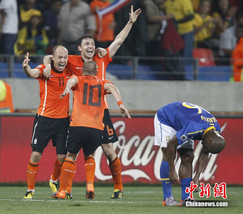 中新網(wǎng)7月2日電 今晚22:00,南非世界杯進行了1/4決賽的首場比賽,由荷蘭隊在伊麗莎白港的曼德拉灣球場迎戰(zhàn)巴西。雖然羅比尼奧在上半場率先破門,但下半場憑借梅洛的烏龍球和斯內(nèi)德頭槌建功,荷蘭隊2-1逆轉(zhuǎn)擊敗巴西隊,率先挺進四強。
