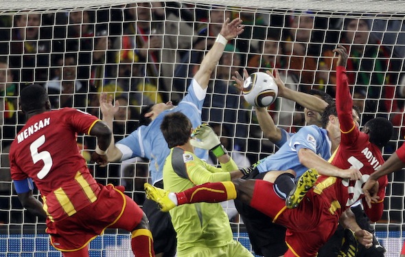 在比賽進行到第121分鐘,加納隊在烏拉圭隊門前連續(xù)形成機會,第一次射門被蘇亞雷斯在門前用身體擋出,不過當加納隊的小將阿迪亞補射空門時,在球門線上的蘇亞雷斯將球用手擋出。裁判向他出示了紅牌,將其罰下,并判給加納隊一個點球。