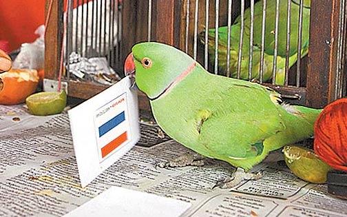 報(bào)道稱,“神鳥(niǎo)”曼尼13歲,主人是80歲算命師穆尼亞龐(M.Muniyappan),曼尼走出鳥(niǎo)籠,在印有西班牙和荷蘭國(guó)旗的紙牌中,用嘴叼出荷蘭牌,之前4強(qiáng)賽,曼尼也猜中西班牙贏球。