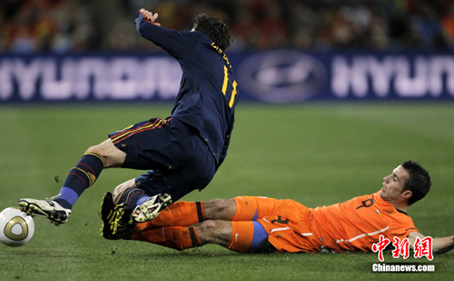 中新網(wǎng)7月12日電 今天凌晨2:30,南非世界杯迎來了最終的決賽,由荷蘭隊在約翰內(nèi)斯堡的足球城球場對陣西班牙。最終雙方經(jīng)過120分鐘鏖戰(zhàn),由伊涅斯塔在第116分鐘攻入唯一一粒進球,絕殺十人應(yīng)戰(zhàn)的荷蘭隊,史上首次奪得冠軍。