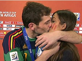 西班牙在首戰(zhàn)對(duì)陣瑞士的小組賽中被中場(chǎng)費(fèi)南德斯攻進(jìn)一球,卡西利亞斯撲救不及,讓西班牙最后輸?shù)舯荣。?dāng)時(shí),卡西的美艷記者女友卡波內(nèi)羅就站在球門后。她在賽后現(xiàn)場(chǎng)報(bào)導(dǎo)時(shí)毫不客氣地質(zhì)問(wèn)男友:“你是怎么把比賽搞砸的?”