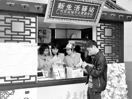 昨天下午當(dāng)班的黃洪丹,是廣東交通職業(yè)學(xué)院的大二學(xué)生,也是同行8人的班長。她為記者一一介紹了站內(nèi)各種方便設(shè)施,告訴記者今天短短幾個(gè)小時(shí),她們已經(jīng)接待了100多位前來咨詢的朋友,“就是剛才,我們剛給一大幫外國朋友指了去亞運(yùn)村的路呢!