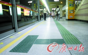 廣州市近年專(zhuān)門(mén)在《迎亞運(yùn)市政道路大中修工程管理指引》要求全市的無(wú)障礙通道統(tǒng)一采用全寬式無(wú)障礙通道,設(shè)置仿花崗巖車(chē)止石,防止機(jī)動(dòng)車(chē)駛?cè)肴诵械。主次干道采用兩?0×30盲道磚,一般道路采用一排盲道磚。同時(shí),要求所有新建道路建設(shè)必須同步配備無(wú)障礙盲道等建設(shè)規(guī)劃,否則不予通過(guò)建設(shè)審批。