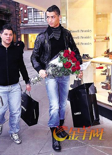 24歲的曼聯(lián)球星當天攜一名友人一起出行,他們在曼徹斯特一家高級商店花了1萬英鎊,買走了幾套休閑服裝。真可謂一擲千金。而當天還有C·羅的球迷發(fā)現(xiàn)了他們,興奮的球迷送給了C·羅一束火紅的玫瑰。手持玫瑰的C·羅看上去更加娘娘腔了。