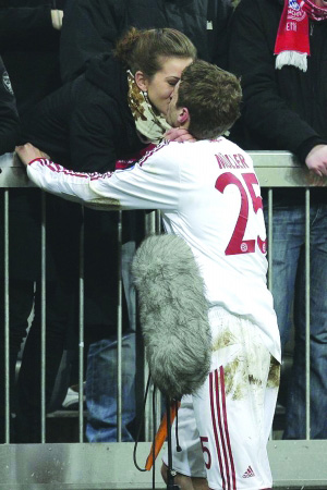 這位在租借而來的前鋒多諾萬(wàn)回到美國(guó)大聯(lián)盟之后才得到出場(chǎng)機(jī)會(huì)的小將,在昨晨比賽的第72分鐘登場(chǎng),這也是他在歐冠聯(lián)賽中的處子秀,然而17分鐘過后,他就在一次角球混戰(zhàn)中攻入了個(gè)人的歐冠聯(lián)賽處子球。進(jìn)球后的穆勒顯得非常興奮,飛奔到看臺(tái)上女友所在的位置,而他的女友很默契地送上了浪漫一吻?吹竭@對(duì)恩愛的小情侶,現(xiàn)場(chǎng)所有觀眾都送出了自己的掌聲。