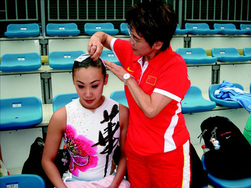 此后的一天半,張曉歡不太記得是怎么過(guò)來(lái)的。能回憶起的,就是比賽當(dāng)天水立方里的燈光,全場(chǎng)坐滿了人,她們的三位教練:鄭嘉、汪潔、井村雅代望著這九個(gè)姑娘。