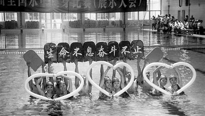 在“你說你的美麗已經(jīng)不再,地動山搖將你變得蒼白”的朗誦聲中,阿壩師專拉拉操隊(duì)員開始了他們的自選動作表演——一套反映從地震發(fā)生時(shí)的無助到重建家園信心十足的水中健身操。