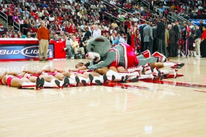 中國(guó)德比的主角自然應(yīng)該是姚明和易建聯(lián)。可是火箭的吉祥物火箭熊非!安凰保獡寭寖蓚(gè)東方大個(gè)子的風(fēng)頭,招數(shù)就是:耍流氓!面對(duì)躺在地板上任“熊”宰割的美女們,火箭熊就差沒流口水了,一點(diǎn)也不憐香惜玉的把碩大的身體壓在美女們身上(上圖)。不過昨天可是火箭熊14歲大壽,天大地大壽星公最大,在自己的主場(chǎng)撒撒野也是無可厚非的。