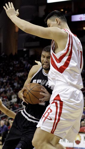 北京時(shí)間3月15日消息,在今天早上進(jìn)行的一場(chǎng)NBA常規(guī)賽中,昨天擊敗了山貓的火箭沒有能夠取得連勝。面對(duì)西南賽區(qū)的第一名圣安東尼奧馬刺,姚明拿到了18分11個(gè)籃板球,鄧肯拿到了15分12個(gè)籃板;鸺詈箨P(guān)頭連續(xù)錯(cuò)失反超和扳平拖入加時(shí)的機(jī)會(huì),最終以85比88遺憾的輸給了馬刺。