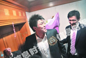 昨天搶新娘的“吉時”定在了凌晨12:15,不過晚上11點左右杜鋒和家人已經(jīng)整裝待發(fā),可他卻表示自己并不緊張,“很平靜,”杜鋒表示對搶新娘這事一點都不擔(dān)心,“該強(qiáng)攻的就強(qiáng)攻,該智取的就智取!碑(dāng)被問及是搶新娘難還是奪CBA總冠軍難時,杜鋒得意地笑了:“我不搶,她也得跟我走!