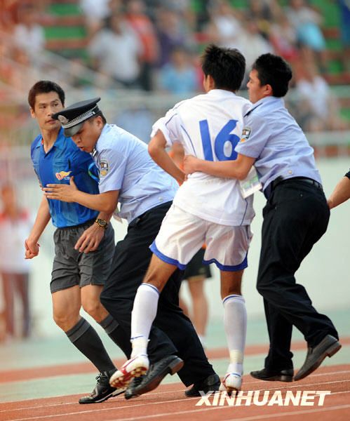 “什么都別說(shuō)了,比賽結(jié)束后打××邊裁!边叢迷谔旖蜿(duì)禁區(qū)外右側(cè)的一次判罰引起李根的咒罵。補(bǔ)時(shí)4分鐘用盡,天津隊(duì)沒(méi)有來(lái)到中圈與北京隊(duì)握手致意,而是徑直沖向球場(chǎng)邊的裁判。何志彪先是站在那里等待其他兩名助理裁判,當(dāng)他看到李根以及其他隊(duì)員沖向自己的時(shí)候,立刻朝休息室跑去。12號(hào)趙世桐跑在最前面,他飛身將何志彪撲倒,后面隊(duì)員也先后加入“戰(zhàn)局”。