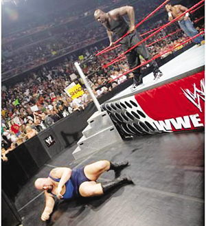 奧尼爾的摔角可能還會有續(xù)集。他并不是第一個(gè)走上職業(yè)摔角擂臺的球員,卡爾·馬龍和羅德曼曾經(jīng)在這里交手過。 (吳哥)