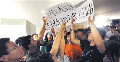 昨天上午11點(diǎn),300余名國安球迷涌入國安足球俱樂部內(nèi)短短二三十米長的通道,他們高舉著“黃牛大哥,給我們留條活路”的標(biāo)語,情緒十分激動,抗議“黃牛”壟斷門票,要求俱樂部保障球迷的利益。由于人數(shù)眾多,現(xiàn)場的暖氣片也被球迷擠壞,暖氣管道里的水灑了一地,廢棄的飲料瓶等雜物也隨處可見。陸續(xù)有數(shù)名民警趕到現(xiàn)場維持秩序,防止球迷出現(xiàn)過激行為。