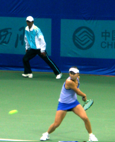 一襲紫裝、淺笑盈盈,率領(lǐng)天津隊(duì)奪得了中國(guó)第十一屆運(yùn)動(dòng)會(huì)濟(jì)南賽區(qū)首枚金牌的彭帥,和隊(duì)友李喆信步走進(jìn)中心賽場(chǎng)。四年前的南京,同樣是這個(gè)天津姑娘,十九歲的她站在領(lǐng)獎(jiǎng)臺(tái)上淚流滿面,隨即賭氣似地摘下項(xiàng)上的銀牌。誰(shuí)都知道,她想要的是金牌。四年后的濟(jì)南,十一運(yùn)會(huì)網(wǎng)球女子團(tuán)體賽中她拿到了金牌。今天,她又微笑著回來(lái)了。在今天上午的女子單打中,彭帥當(dāng)仁不讓,以二比零橫掃北京隊(duì)趙依靜。