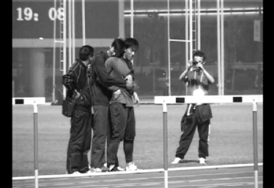 跨完一組欄后,劉翔站在跑道邊,叉著腰休息。這時(shí),一名站在一旁、身穿黑色T恤、身背帶有參賽號碼布背包的男運(yùn)動(dòng)員突然走到劉翔身后,從身后將劉翔雙手抱住。隨后的舉動(dòng)更加雷人,該男子居然做出一副小鳥依人的模樣,還將頭靠在劉翔的肩頭。一邊陶醉地抱著,該男子還一邊在劉翔耳邊耳語了兩句。