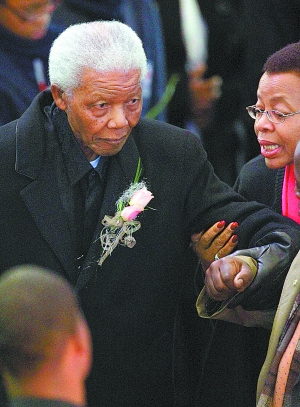 澤娜妮是在世界杯開幕前夜不幸遇難的,91歲高齡的曼德拉也因此取消了出席開幕式的計劃。上午8時,悼念儀式在學(xué)校禮堂舉行。熱愛音樂的澤娜妮生前是該校唱詩班和樂隊的成員,幾乎每個人都喜歡這位性格開朗、活潑的小女孩。儀式以一首悼念歌曲開始,緊接著播放了一組幻燈片,由澤娜妮與曼德拉開心擁抱的合影組成。隨后,幾位親屬代表上前致悼詞。老曼德拉也在親人的陪伴下,步履蹣跚地來到儀式現(xiàn)場,他的衣襟上別著一小簇粉紅色的花束,始終坐在前排,神情十分哀傷。