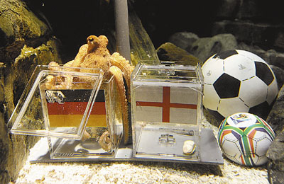 這只名為保羅的兩歲大章魚(yú)恰巧生于英國(guó),在德國(guó)長(zhǎng)大。海洋館員把分別印有德、英旗幟的貝殼放入玻璃缸,結(jié)果保羅只取出德國(guó)那枚貝殼。保羅之前也曾“估中”德國(guó)勝澳洲、加納與輸給塞爾維亞的賽果,德國(guó)隊(duì)在上屆歐國(guó)杯的賽事,其預(yù)測(cè)命中率也有8成。