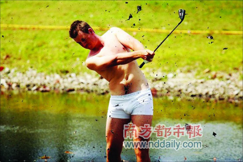 在上周的CA錦標(biāo)賽中,斯滕森為了救出在泥潭里的球,不惜脫掉衣服鞋襪,只穿了一條白色內(nèi)褲去救球。有人因此嘲笑斯滕森就像CK內(nèi)褲模特,不過(guò)斯滕森并不在意。本周二,泰格·伍茲在和斯滕森一起參加特維斯特克杯的時(shí)候,饒有興致地向斯滕森贈(zèng)送了兩條相同款式的白色黑邊內(nèi)褲。伍茲還在內(nèi)褲上親筆簽下了自己的名字,斯滕森很高興地接受了這兩條絕無(wú)僅有的內(nèi)褲。