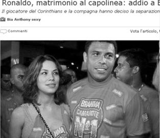 人們普遍媒兩人的情感危機還是出在“花心大蘿卜”羅納爾多身上,安東妮已經(jīng)實在無法忍受 “外星人”的頻繁出軌。羅納爾多的前幾次分手情況也和這次類似,1999年羅納爾多與米蘭妮在香港結(jié)識,同年的平安夜正式結(jié)婚,并育有一子,但羅納爾多多次的緋聞事件令兩人離婚;2005年2月羅納爾多與巴西女主播兼模特茜卡蕾莉在一個古堡中舉行了聲勢浩大的訂婚晚會,但是隨著茜卡蕾莉在羅納爾多車子的后座發(fā)現(xiàn)避孕套,兩人的婚禮被取消。