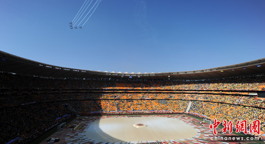 開幕儀式前,南非共和國的空軍進(jìn)行了飛行表演。五架飛機(jī)在世界杯賽場滑翔而過。贊美詩表演者以獨(dú)特的方式,召喚人們走入開幕式現(xiàn)場,載歌載舞,歡慶世界杯首次來到非洲大陸。