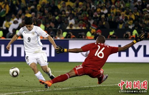 比賽開始后,場面進行的比較平淡。第6分鐘烏拉圭獲得前場任意球機會,弗蘭主罰的皮球被皮納爾提前從人墻中沖出用手擋出,被主裁判出示黃牌。隨后,蘇亞雷斯和弗蘭在南非隊前場打出配合,蘇亞雷斯的射門偏出。隨后弗西萊也有一腳射門偏出。