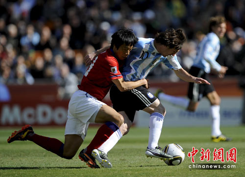 中新網(wǎng)6月17日電 北京時間今晚19點30分,2010年南非世界杯B組第二輪的首場比賽打響,由兩屆世界杯冠軍得主阿根廷隊迎戰(zhàn)亞洲“太極虎”韓國隊。16分鐘韓國隊前鋒樸周永不慎打入本屆世界杯的第二記烏龍;33分鐘阿根廷再獲得定位球,伊瓜因門前頭槌建功,2-0;上半場補時階段韓國隊由李青龍扳回1球,但下半場伊瓜因連入2球,上演本屆世界杯的第一個帽子戲法,助阿根廷4-1鎖定勝局,提前小組出線。
