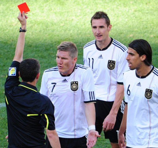 在上半場,德國隊還占據場上的主動。不過克洛澤在第12分鐘就吃到一張黃牌,而其隊友也不斷被西班牙隊出示黃牌。第37分鐘,克洛澤在防守斯坦科維奇時,先鏟倒了球,這是一個可判可不判的犯規(guī),一般的裁判只會給個口頭警告。結果主裁判烏迪亞諾竟在未口頭警告的情況下,直接就出示第二張黃牌將其罰下。
