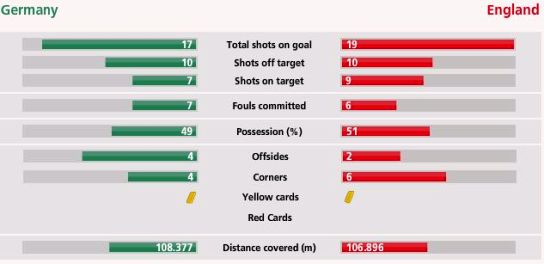 角球方面,德國隊(duì)有4個(gè),少于英格蘭隊(duì)的6個(gè),其中英格蘭隊(duì)利用第一次角球的機(jī)會敲開了德國隊(duì)的大門。