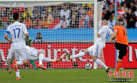 中新網(wǎng)6月28日電 今晚22:00,南非世界杯1/8決賽第五場(chǎng)比賽在德班球場(chǎng)拉開(kāi)戰(zhàn)幕,由E組頭名荷蘭隊(duì)迎戰(zhàn)F2第二名斯洛伐克。憑借羅本和斯內(nèi)德在上下半場(chǎng)的進(jìn)球,荷蘭隊(duì)以2-1淘汰斯洛伐克。補(bǔ)時(shí)階段,維泰克為斯洛伐克隊(duì)攻入一粒安慰性的點(diǎn)球。