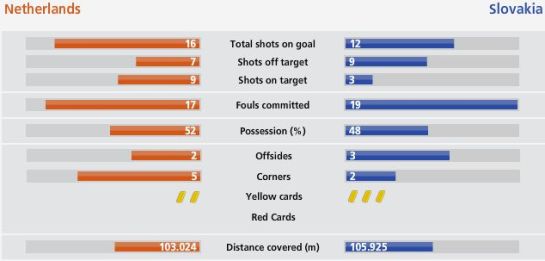 比賽中,荷蘭隊犯規(guī)17次,斯洛伐克隊則犯規(guī)19次。黃牌方面也是荷蘭占優(yōu),只有2張黃牌,斯洛伐克隊得了3張。