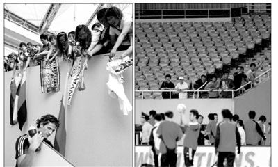 然而,這樣的熱烈氛圍隨著中國隊(duì)的到來消散殆盡。當(dāng)?shù)聡?duì)退場、中國隊(duì)進(jìn)場時(shí),近2000名球迷竟然像潮水退潮一般,轉(zhuǎn)眼就迅速地隨德國隊(duì)一同離場。一名女球迷在撤退時(shí)向同伴高喊:“中國隊(duì)來了,快跑!”最終堅(jiān)持留在體育場看中國隊(duì)訓(xùn)練的球迷,竟然只有屈指可數(shù)的8個(gè)人。(記者鄭小龍)